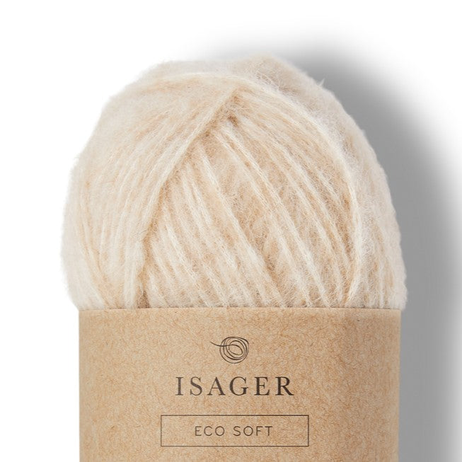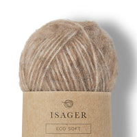 ISAGER ECO SOFT consists of 56% Alpaca and 44% Organic Pima Cotton. Eco Soft can replace the yarn in patterns for sweaters, knitted with Silk Mohair held together with another yarn. Some knitters prefer to knit with one strand only but would still like the fluffy structure, and this look is obtained with Eco Soft. The yarn is undyed and in natural colours.
